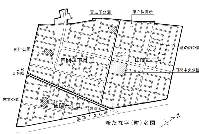 従来の住所は、「荒井字大場伝」「荒井字中在家」「荒井字札屋敷」「荒井字丑ノ頭」「荒井字初田」「伊在字土府」「伊在字東通」「伊在字南通」「蒲町字馬洗場」「六丁の目南町」 他 です。